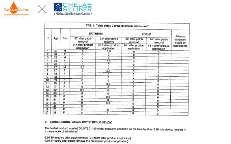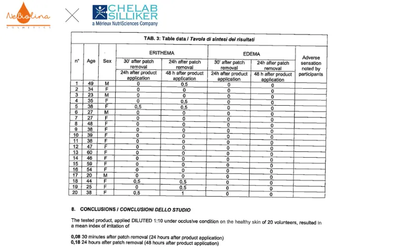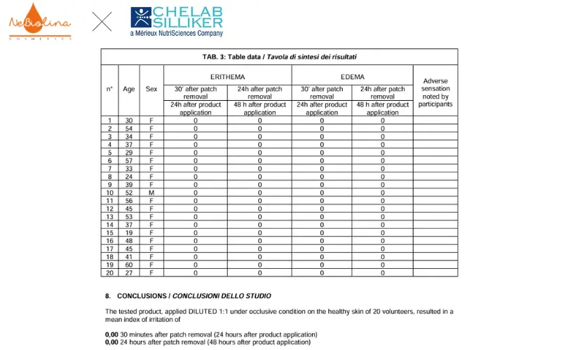 Với những con số này, theo bảng phân loại chuẩn, các sản phẩm của NeBiolina được kết luận là “KHÔNG GÂY KÍCH ỨNG” ngay cả trên làn da nhạy cảm.